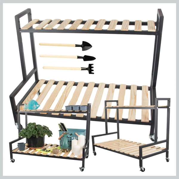 Ez a modern, ipari stílusú virágtartó állvány ideális megoldás, ha egyszerre keresel praktikus, masszív és dekoratív tárolót növényeid számára. A fém váz és természetes fa polcok harmonikus kombinációja időtálló megjelenést biztosít, a 4 darab forgókerék pedig lehetővé teszi a könnyű mozgatást bárhol a lakásban vagy teraszon.