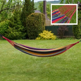 A függőágy alkalmas a pihenésre, különösen a kertben. A szövetágy mérete 150 x 200 cm. A nyugágy pamutból és poliészterből készült. Terhelhetőség: 100 kg.