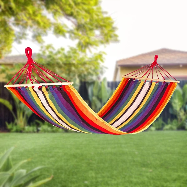 A függőágy alkalmas a pihenésre, különösen a kertben. A szövetágy mérete 80 x 200 cm, fa támasztékokkal. A függőágy pamutból és poliészterből készült. Terhelhetőség: 100 kg.