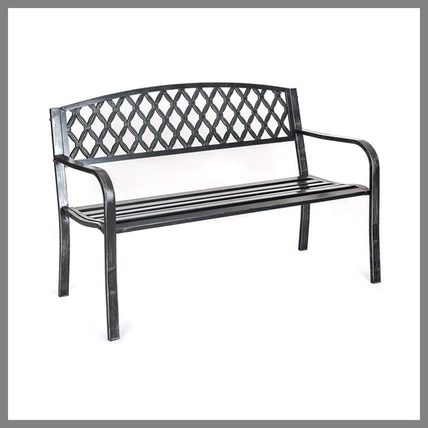Az acél szerkezet és a fekete öntöttvas háttámla kombinációja tartós, erős padot biztosít, amely ellenáll az időjárás viszontagságainak.