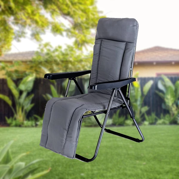 Párnázott összecsukható szék lábtartóval és pozicionálási lehetőséggel (5 pozíció). Anyaga: karfás acél szerkezet, 5 cm vastag 160 g poliészter párnázattal kiegészítve, nagyon kényelmes ülést és pihenést biztosít. A szék teherbírása 100 kg.
