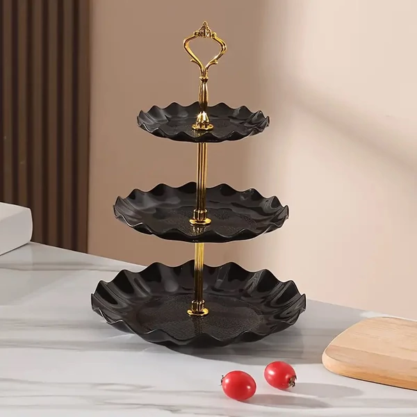 Ez az elegáns háromszintes tálaló tökéletes választás sütemények, gyümölcsök, aprósütemények vagy falatkák stílusos felszolgálásához. A hullámos szélű fekete tálcák modern és exkluzív megjelenést kölcsönöznek, míg az aranyszínű oszlop és fogantyú kifinomult, klasszikus hatást ad a kompozíciónak.
