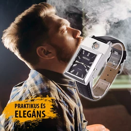 Nem kell többé attól tartanod, hogty kifogy az öngyújtód! Ez az öngyújtós karóra az elegáns megjelenés mellett biztonságos öngyújtóként is működik, elég egy laza modulat és máris rágyújthatsz a cigarettára. Az órát USB kábel segítségével akár 2 óra alatt feltöltheted.