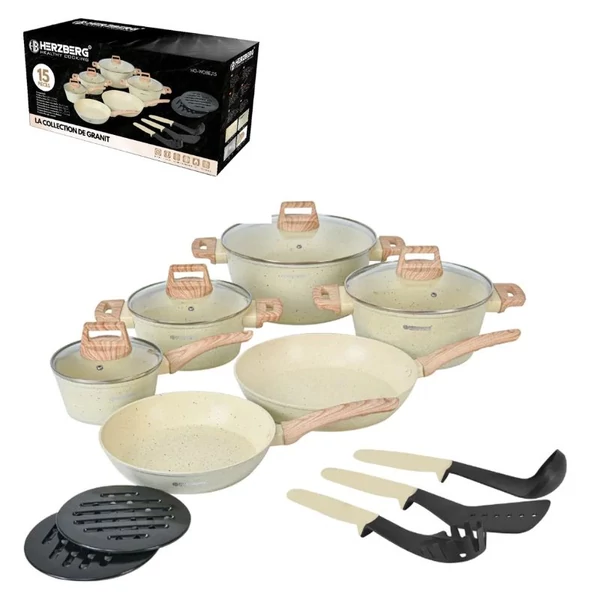 Herzberg 15 részes gránitbevonatú edénykészlet fa hatású fogantyúkkal fehér HG-WDBEJ15