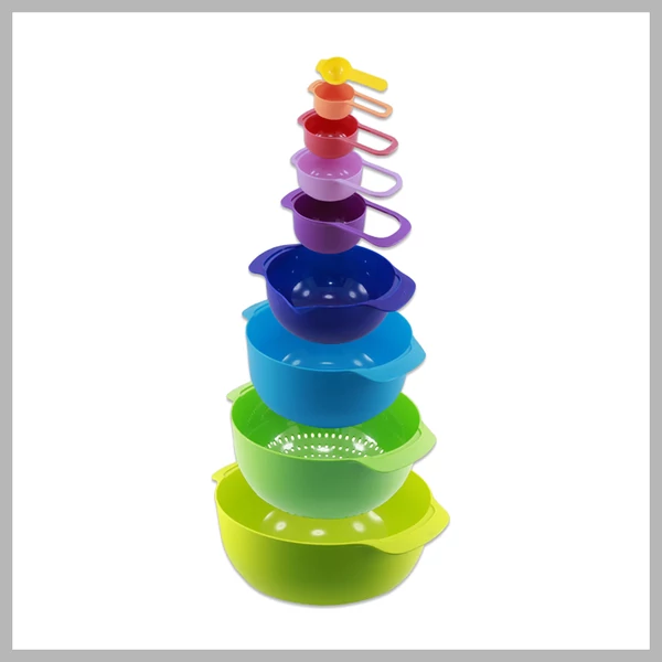 Ez a praktikus és helytakarékos 9 részes ételkészítő készlet tökéletes választás minden konyhába. A készlet kis és nagy keverőtálakat, valamint különböző méretű mérőpoharakat és kanalat tartalmaz, így megkönnyíti a sütés-főzés előkészítését. A kis keverőtál kifolyóval rendelkezik, amely precíz öntést biztosít. A műanyag szűrő segítségével egyszerűen lecsöpögtetheti a hozzávalókat.