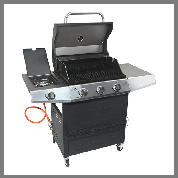 A grill több tárolóhellyel is van felszerelve, beleértve az oldalsó polcot is. A grill egy további oldalsó tűzhelyrel van felszerelve, független szabályozással és gyújtással. A készlet tartalmaz egy csatlakozó tömlőt a gázpalackhoz és a redukciós szelepet.