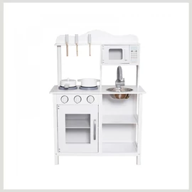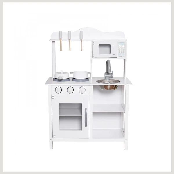 A készlet tartalmaz egy mikrohullámú sütőt, amely bezáródik és kinyílik, így a gyerekek szimulálhatják az ételek melegítését, egy kivehető mosogatót csappal, amely hiteles főzési és tisztítási élményt nyújt, polcokat a főzőeszközök és kiegészítők tárolására, de 3 főzőedényt és 2 edényt is, amelyek közül az egyik fedeles.