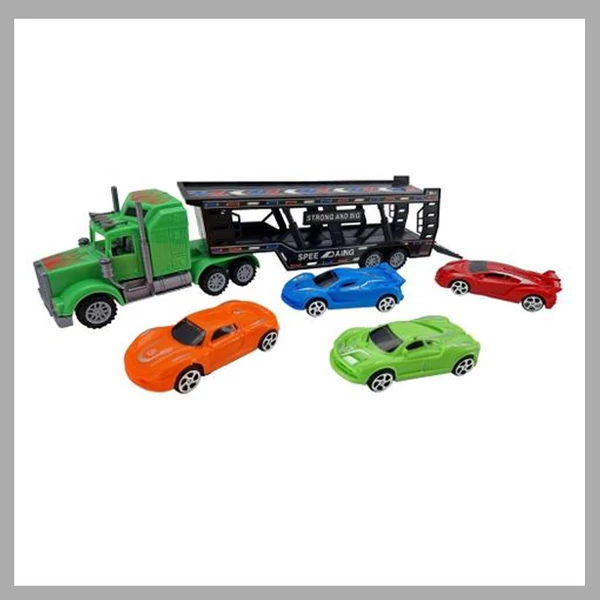 Az autókkal megrakott teherautó műanyagból készült. A teherautó lendkeréken áll. A készlet 4 db személygépkocsit tartalmaz.