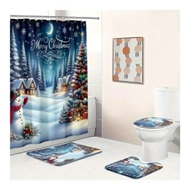 Ünnepi hangulatot árasztó karácsonyi fürdőszoba szett, amely hóemberes és téli tájas mintával díszített. A készlet tartalmaz egy nagy méretű zuhanyfüggönyt, WC-tető huzatot, valamint két szőnyeget, így teljes körű dekorációt biztosít a fürdőszobába.