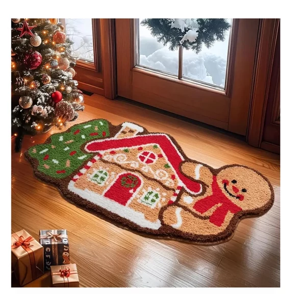 Vidám és hangulatos karácsonyi szőnyeg, amely mézeskalács házikóval, karácsonyfával és mosolygó mézeskalács figurával díszített. A színes, részletgazdag minta ünnepi hangulatot teremt, miközben a szőnyeg puha és kényelmes tapintást biztosít.