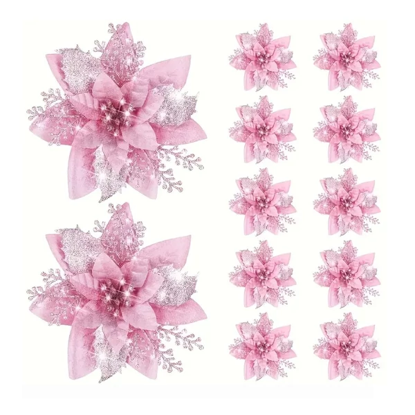 Romantikus és elegáns rózsaszín karácsonyi virágdísz, amely csillogó glitterrel díszítve különleges, modern ünnepi hangulatot teremt. A 15 darabos szett tökéletes kiegészítő karácsonyfákhoz, koszorúkhoz, ajtódíszekhez és ünnepi kompozíciókhoz.