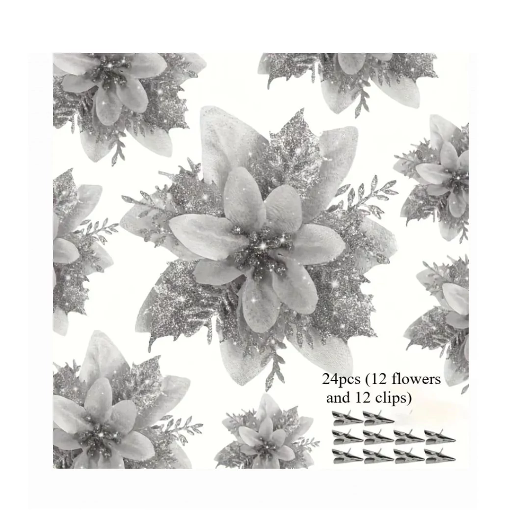 Elegáns ezüst színű karácsonyi virágdísz, amely csillogó felületével modern és ünnepi hangulatot varázsol. A 24 darabos készlet (12 virág + 12 csipesz) ideális karácsonyfák, koszorúk, ajtódíszek és asztali dekorációk feldíszítésére.