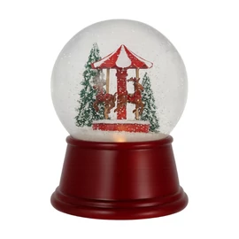 A gömb belsejében egy részletgazdag, mozgó karácsonyi körhinta látható, amelyet LED-fények világítanak meg, miközben a lágy zene és a kavargó hópelyhek életre keltik az ünnepi varázst.