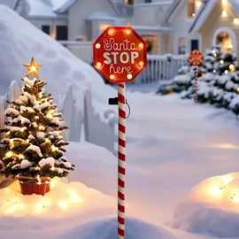 A piros-fehér cukorpálca mintájú oszlop tetején világító „Santa STOP here” tábla található, amely garantáltan feldobja a karácsonyi dekorációt.