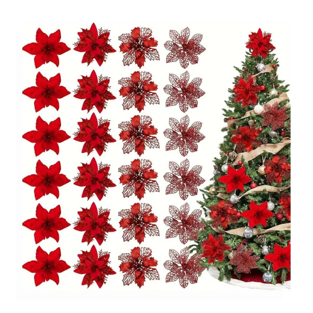 Elegáns és látványos karácsonyi virágdíszek, amelyek tökéletesen feldobják a karácsonyfát, koszorút vagy ünnepi asztaldíszt. A szett 24 darab virágot tartalmaz két színben és többféle stílusban, így változatos és harmonikus dekoráció készíthető.