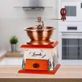 Ennek a kézi kávédarálónak kerámia teste van, fa kiegészítőkkel és fém tartállyal. A kerámia őrlő mechanikája a kívánt vastagságú őrlésre állítható.