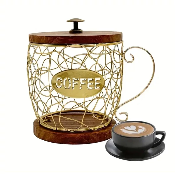 Elegáns és praktikus kávékapszulatartó, amely stílusos arany színű fémhálóval és fa fedéllel rendelkezik. Különleges kialakítása kávéscsésze formát idéz, így nemcsak hasznos, hanem dekoratív kiegészítője is lehet a konyhának.