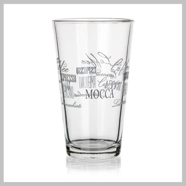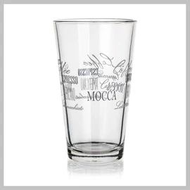A 480 ml-es kúp alakú üveg átlátszó üvegből készült, kávés dekorral. A pohár hideg italok tárolására alkalmas. Ez egy közönséges asztali üveg. A termék nem mosogatógépben mosható.