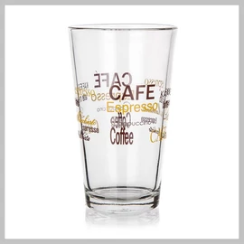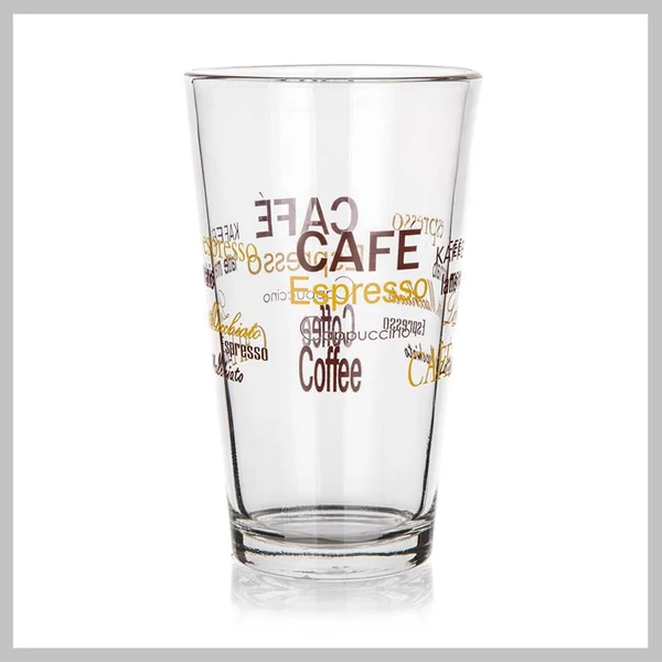 A 480 ml-es kúp alakú üveg átlátszó üvegből készült, kávés dekorral. A pohár hideg italok tárolására alkalmas. Ez egy közönséges asztali üveg. A termék nem mosogatógépben mosható.