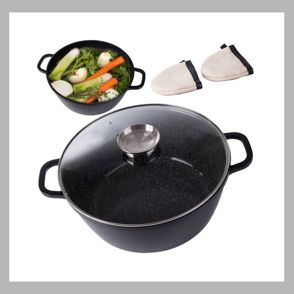 Az edény kiváló minőségű alumíniumötvözetből készült, amelyet nyomás alatt öntöttek. Könnyű , mégis erős és hatékonyan vezeti a hőt . Ez ideálissá teszi ételek főzéséhez különféle típusú tűzhelyeken, beleértve az indukciós tűzhelyeket is.