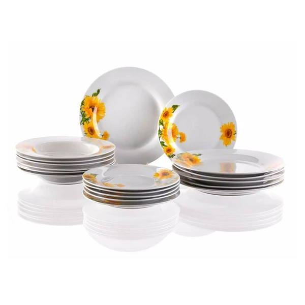 Napfényes 18 részes tányérkészlet, a készlet tartalma: 6 x sekély tányér 24 cm, 6 x mélytányér 21,5 cm, 6 x desszerttál 19 cm, díszcsomagolással.