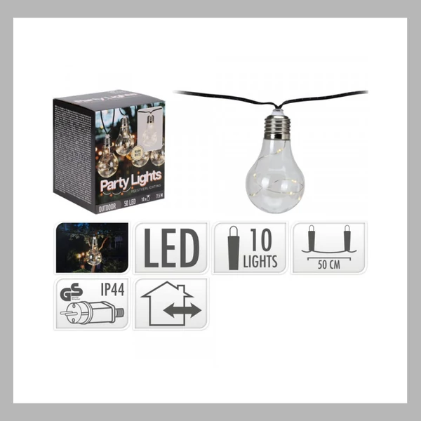 Hossza: 450 cm csatlakozó kábel: 300 cm az izzók közötti távolság: 50 cm IP44 adapterrel. Alkalmas beltéri és kültéri használatra fogyasztás: 0,8W