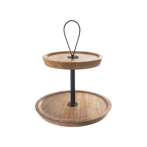 Ez a stílusos két szintes tálaló állvány tökéletes választás, ha elegánsan szeretné bemutatni édességeit, gyümölcsöket, vagy akár dísztárgyakat. A fa tálcák meleg, természetes megjelenést biztosítanak, míg a fekete fém szerkezet ipari stílust ad hozzá, így modern és rusztikus hangulatot varázsol otthonába.