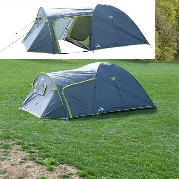 Kétrétegű sátor előszobával, bármilyen időjárásra. Méretei 230 x 335 (125 + 210) x 140 cm, tágas, 3 fős sátor.