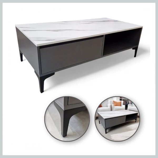 Ez a modern és elegáns kétszintes dohányzóasztal tökéletes kiegészítője lehet bármilyen nappalinak. A tágas asztallap és az alsó polc bőséges helyet biztosít könyvek, magazinok vagy dekorációs tárgyak számára, miközben a márványhatású fehér és grafit színkombináció kifinomult megjelenést kölcsönöz a térnek.