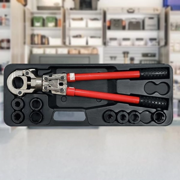 Krimpelő fogó műanyag vízvezetékekhez PEX-AL-PEX, PERT-AL-PERT 8 db U és TH cserélhető pofával.