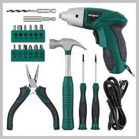 Otthoni karbantartáshoz tervezett, kompakt és hordozható szerszámkészlet, amely vezeték nélküli, újratölthető elektromos csavarhúzót és számos alapvető kéziszerszámot tartalmaz.