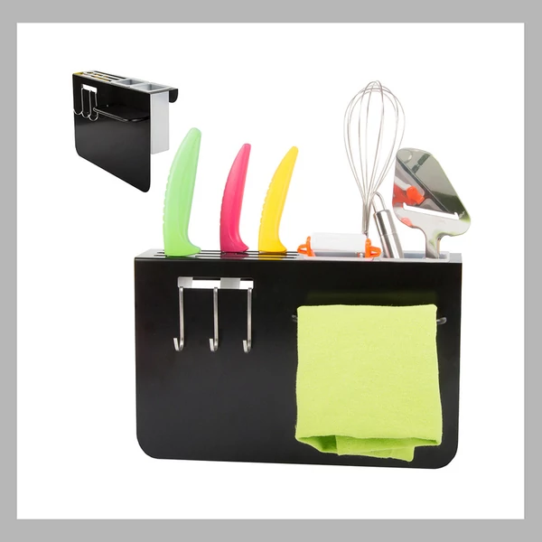 A rendszerező falra szerelhető, így sok helyet takarít meg a konyhapulton. Ragasztóval vagy a készletben található csapokkal és csavarokkal rögzíthető.
