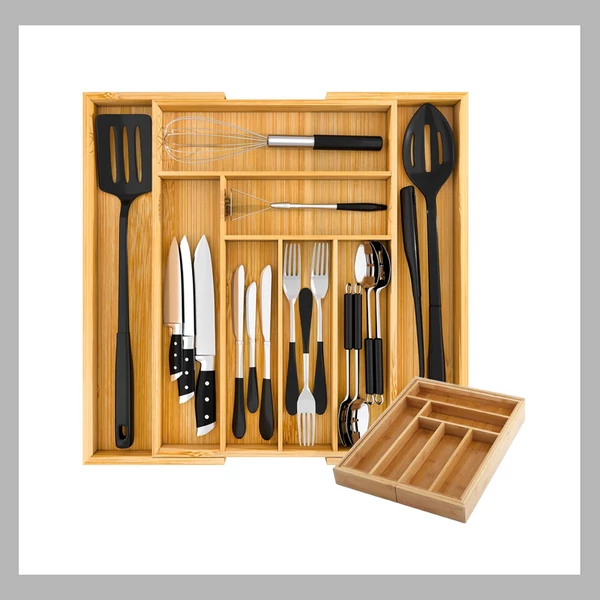 Bambusz evőeszköz-rendező 8 rekesszel - ideális megoldás azok számára, akik az esztétikai feláldozás nélkül szeretnék rendben tartani konyhájukat .