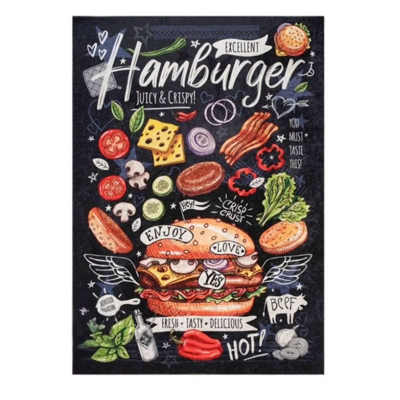 Ez a vidám és modern konyhai szőnyeg tökéletes választás minden olyan konyhába, ahol a stílus és a praktikum kéz a kézben jár. A hamburgert és friss alapanyagokat ábrázoló mintája játékos hangulatot teremt, miközben a mindennapi konyhai tevékenységekhez is kényelmet biztosít.
