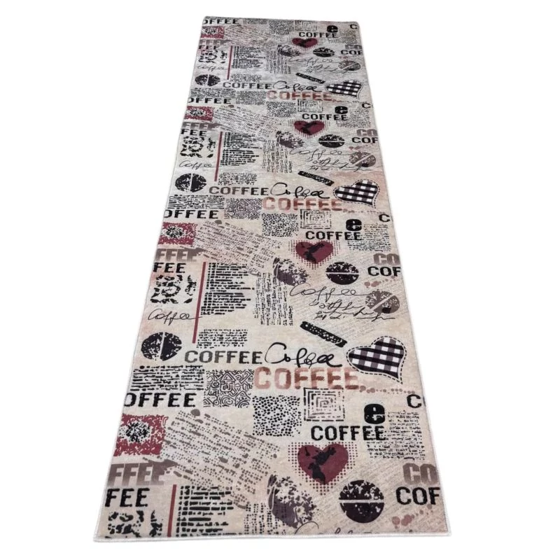 A kávés mintával díszített bézs konyhai szőnyeg nemcsak praktikus megoldás, hanem hangulatos dekoráció is, amely kellemes, barátságos atmoszférát teremt otthonában.
