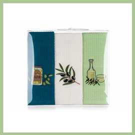 - 3 darab dekoratív konyharuha 3 különböző színben és 3-féle olivás mintával.
