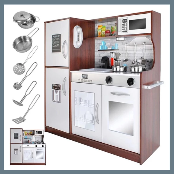 A konyha 3 éves és idősebb gyermekek számára készült, és a sötétbarna és fehér árnyalatok vonzó kombinációjában készült.