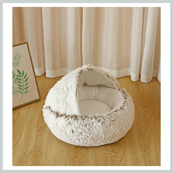 Plüss macska vagy kutya ágy, amelyet kifejezetten a kényelem és a biztonság érzetének megteremtésére terveztek. Ideális választás macskák és kisebb háziállatok számára, akik szeretnek meleg és puha helyen pihenni.