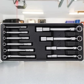 10 db-os villáskulcs készlet CrV acélból. A készlet jól illeszkedik a PVC-fiók betétébe.