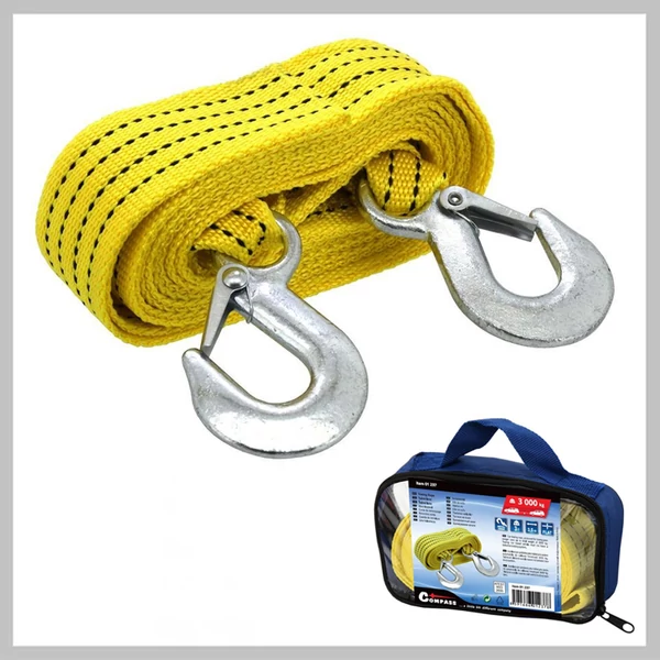 Lapos autókötél, vontatószíj személygépkocsikhoz, legfeljebb 3000 kg össztömegig. A szíj egy praktikus, cipzáras táskában tárolható.