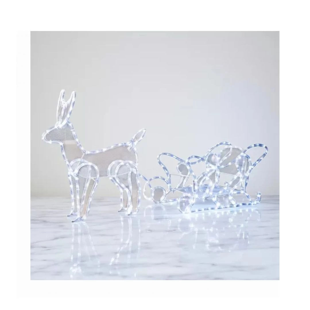 Lélegzetelállítóan látványos karácsonyi LED dekoráció, amely egy világító rénszarvast és egy elegáns szánt ábrázol. Tökéletes választás, ha ünnepi hangulatot szeretnél teremteni otthonodban, kertedben vagy kirakatban.