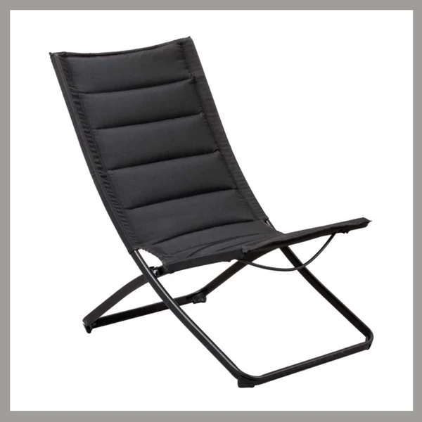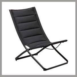 A képen látható termék egy összecsukható kültéri pihenőszék, párnázott ülőfelülettel és fém vázzal. Az ilyen típusú székek jellemzően könnyűek, de stabilak, így egyszerűen mozgathatók.