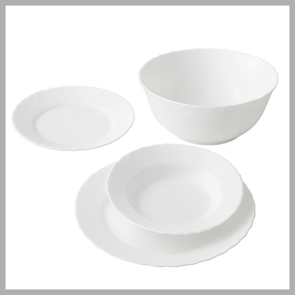 A Luminarc Trianon 19 részes étkészlet elegáns megjelenésével és tartós opálüveg anyagával tökéletes választás a mindennapi és ünnepi étkezésekhez egyaránt. A készlet finoman hullámos szélű, letisztult fehér tányérjaival modern és klasszikus asztalterítékekhez is illik.