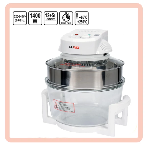 Az 1400 W-os készülék fogyasztása 3x-5x gyorsabb sütést biztosít a hagyományos sütőhöz képest. A teljesítmény fokozatmentesen állítható (65-250 °C), ezen felül az időzítő 60 percre állítható.