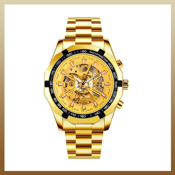Elegáns és stílusos arany színű férfi karóra, amely az időtlen design és a kiváló minőségű anyagok tökéletes kombinációját kínálja. A karóra mechanikus szerkezettel rendelkezik, garantálva a pontos idő jelzését.