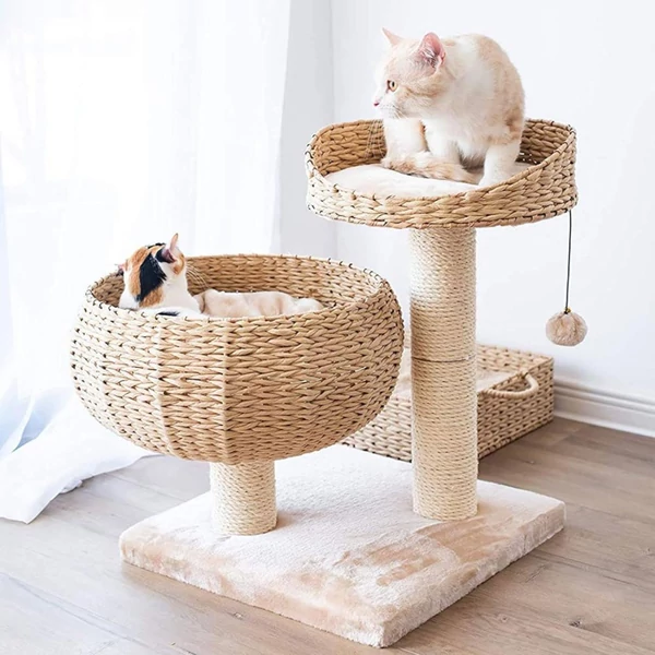 Két szinten elhelyezett fonott mászófa macskabútor formában. Kiváló pihenőhely cicáknak, puha párnákkal és stabil talppal, természetes designnal, 8 cm átmérővel, magasság 55 cm, bézs