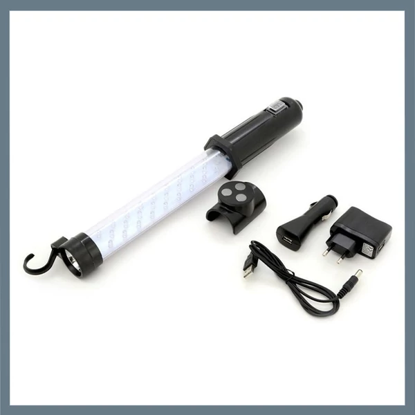 Hordozható, újratölthető szerelőlámpa csúszásmentes gumírozott borítással, ütés- és fröccsenésálló kialakítással. Tökéletes választás műhelybe, autószereléshez vagy ellenőrzési munkákhoz.