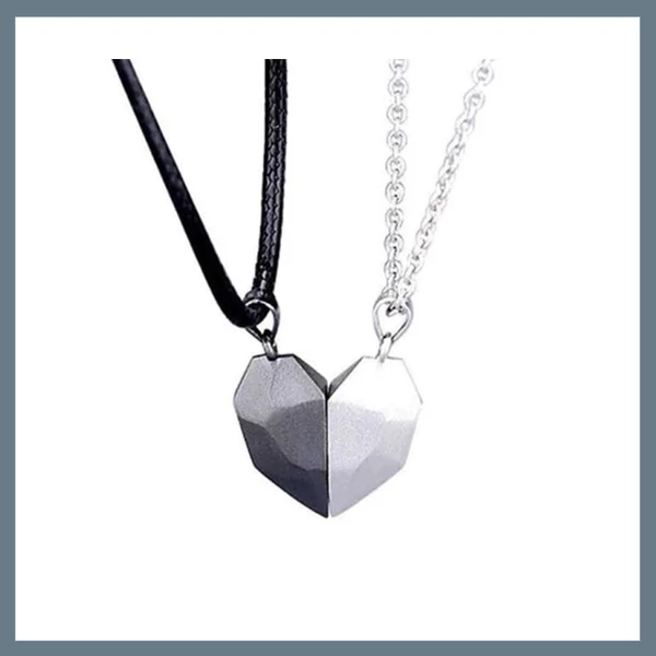 A két mágneses fél szívvel ellátott nyaklánc tökéletesen összeilleszthető, így kifejezve az összetartozást.