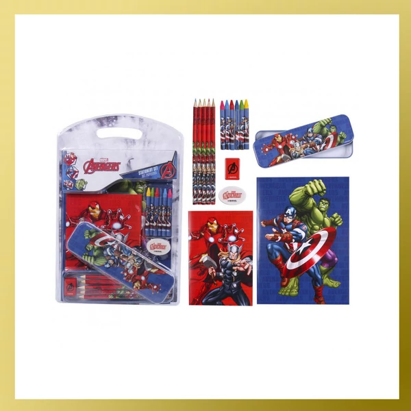 Rendkívül kiterjedt tanszerek készlete jogosítványlenyomattal Avengers . A 16 részes készlet tartalmaz egy A4-es füzetet, egy A5-ös füzetet, egy hegyezőt, egy vonalzót, egy tolltartót, 4 színes ceruzát, egy ceruzát, 6 színes ceruzát. Minden nagy buborékfóliába csomagolva remekül néz ki a boltban, és felkelti a vásárlók figyelmét.