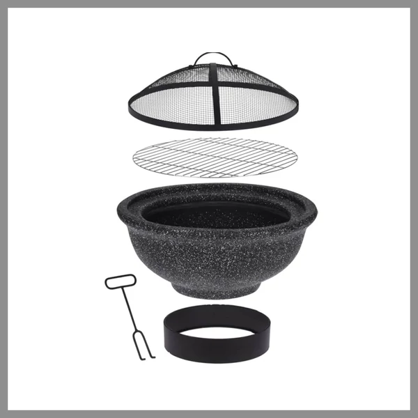 Modern kialakítású tűztál, amely grillezőként is használható. Súlyának és robusztus felépítésének köszönhetően rendkívül stabil. A készlet tartalmaz szikrafogó fedelet, grillezőrácsot és piszkavasat is.